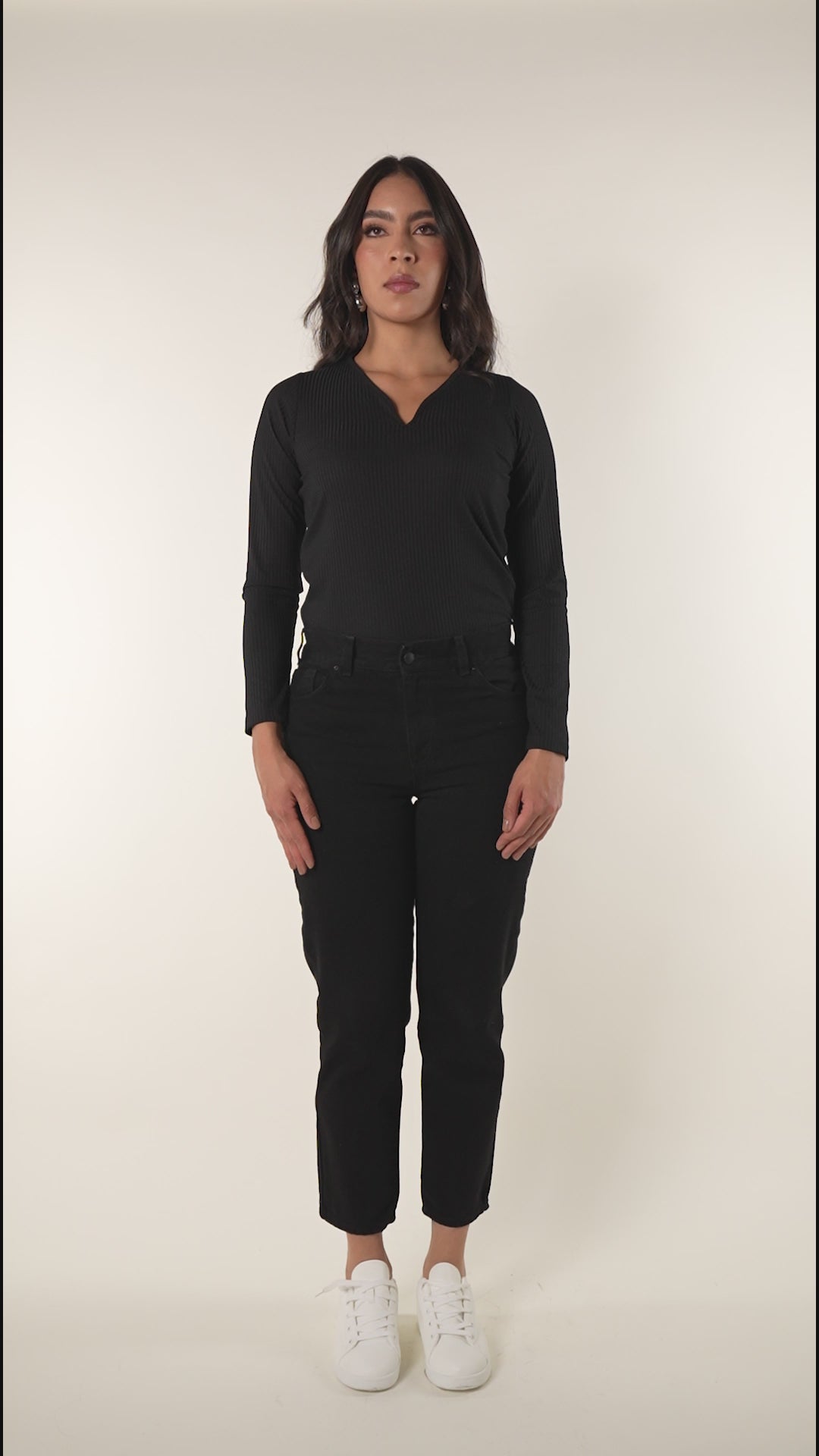 Esta camiseta de manga larga en color negro es perfecta para quienes buscan un estilo sofisticado sin perder comodidad. Con un favorecedor cuello en V y un diseño en tela acanalada, añade textura y ajuste impecable. Está confeccionada en una mezcla de 95% poliéster y 5% elastano, ofreciendo la elasticidad ideal para adaptarse a cualquier figura, además de ser suave al tacto. Ideal para combinar en atuendos casuales o más formales, brindando versatilidad para el día a día.