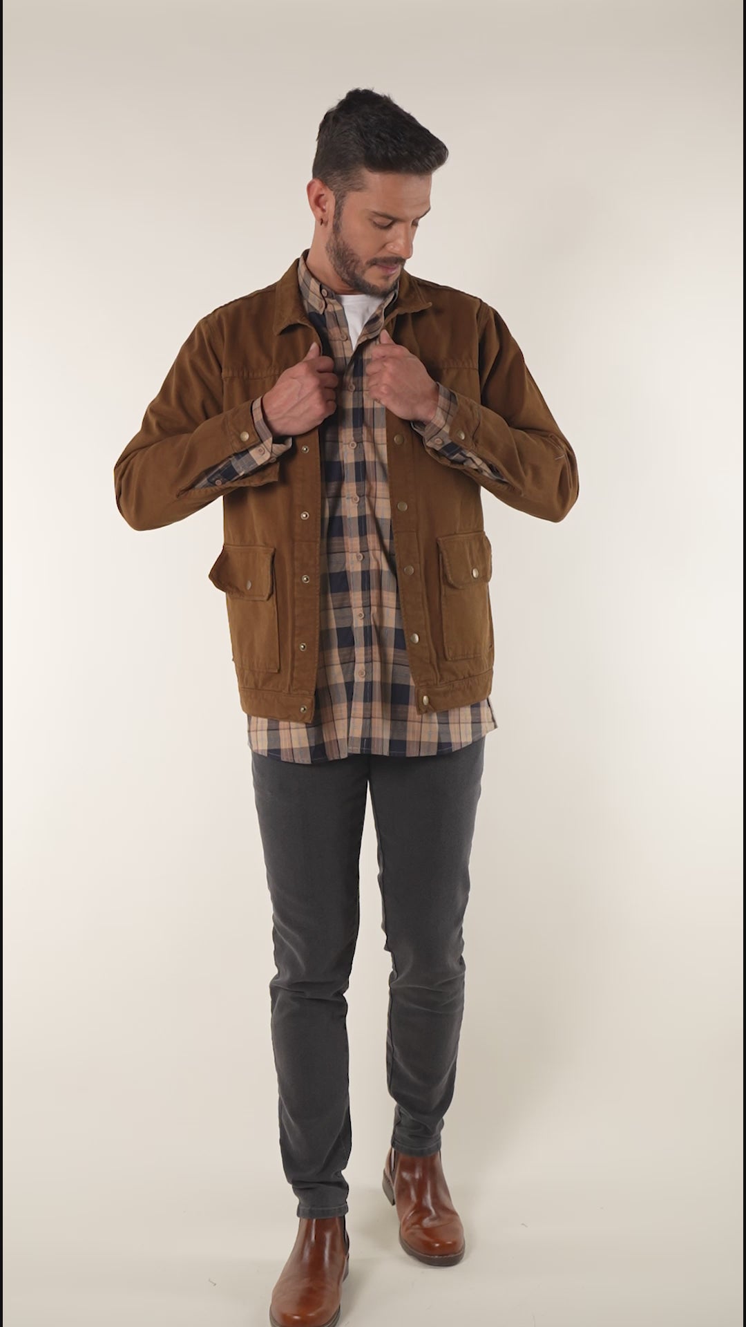 Esta chaqueta de hombre en color tabaco es perfecta para quienes buscan una prenda funcional y con estilo. Diseñada con cierre de broches y bolsillos frontales amplios, combina practicidad y comodidad en un solo diseño. Confeccionada en 100% algodón, asegura una textura suave y duradera, ideal para el uso diario. Su tonalidad tabaco es versátil, permitiendo combinarla fácilmente con distintos outfits, ya sea para un look casual o un estilo más formal. Perfecta para cualquier temporada, esta chaqueta te acompañará con estilo y comodidad.